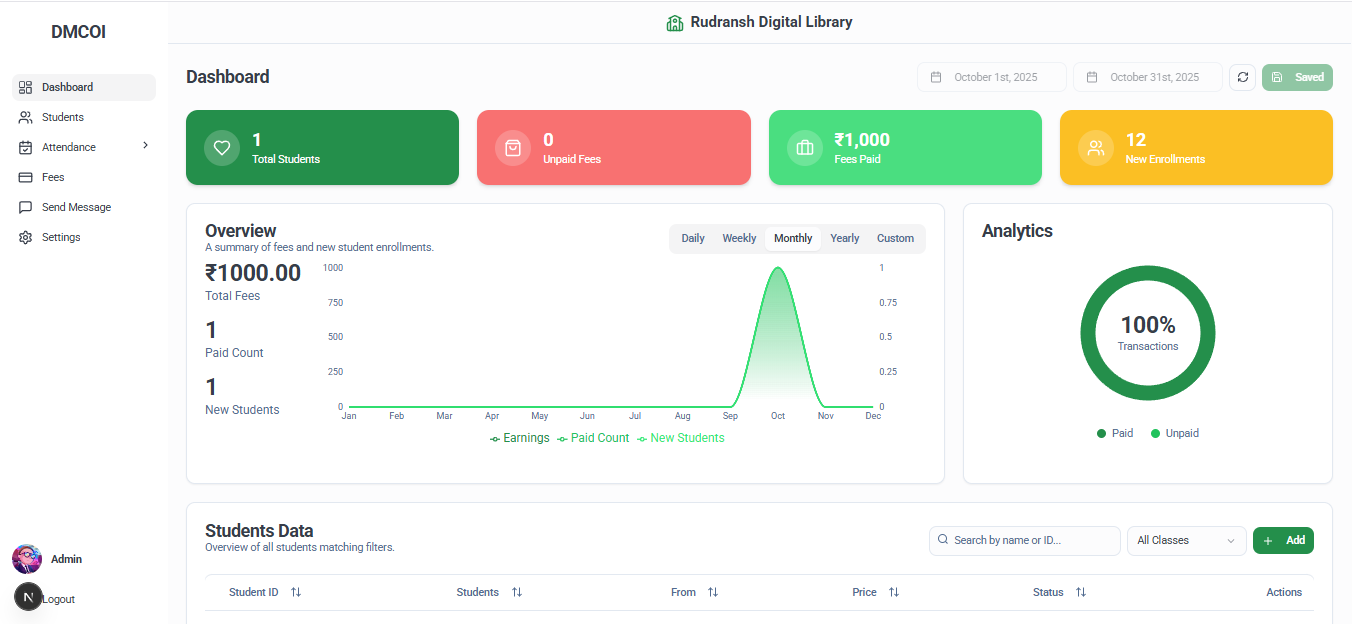 Track library statistics, manage paid and unpaid students, and handle attendance notifications effortlessly. With DMCOI Shelf, you can save time, reduce manual work, and run your library smarter — powered by automation, analytics, and simplicity.